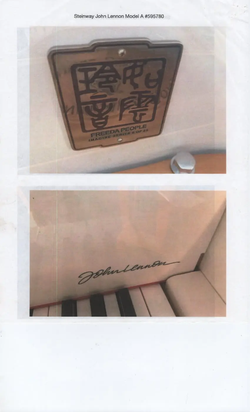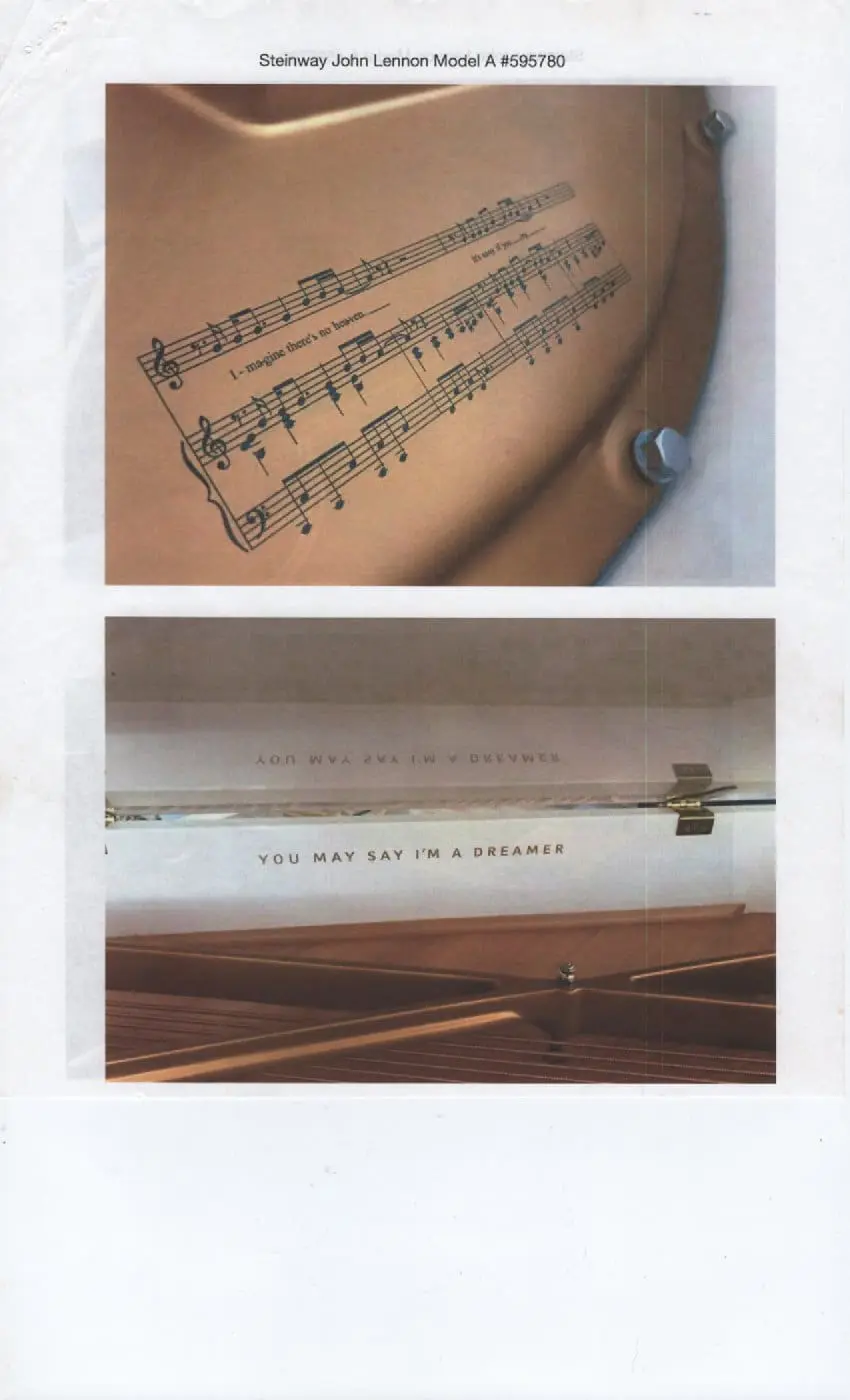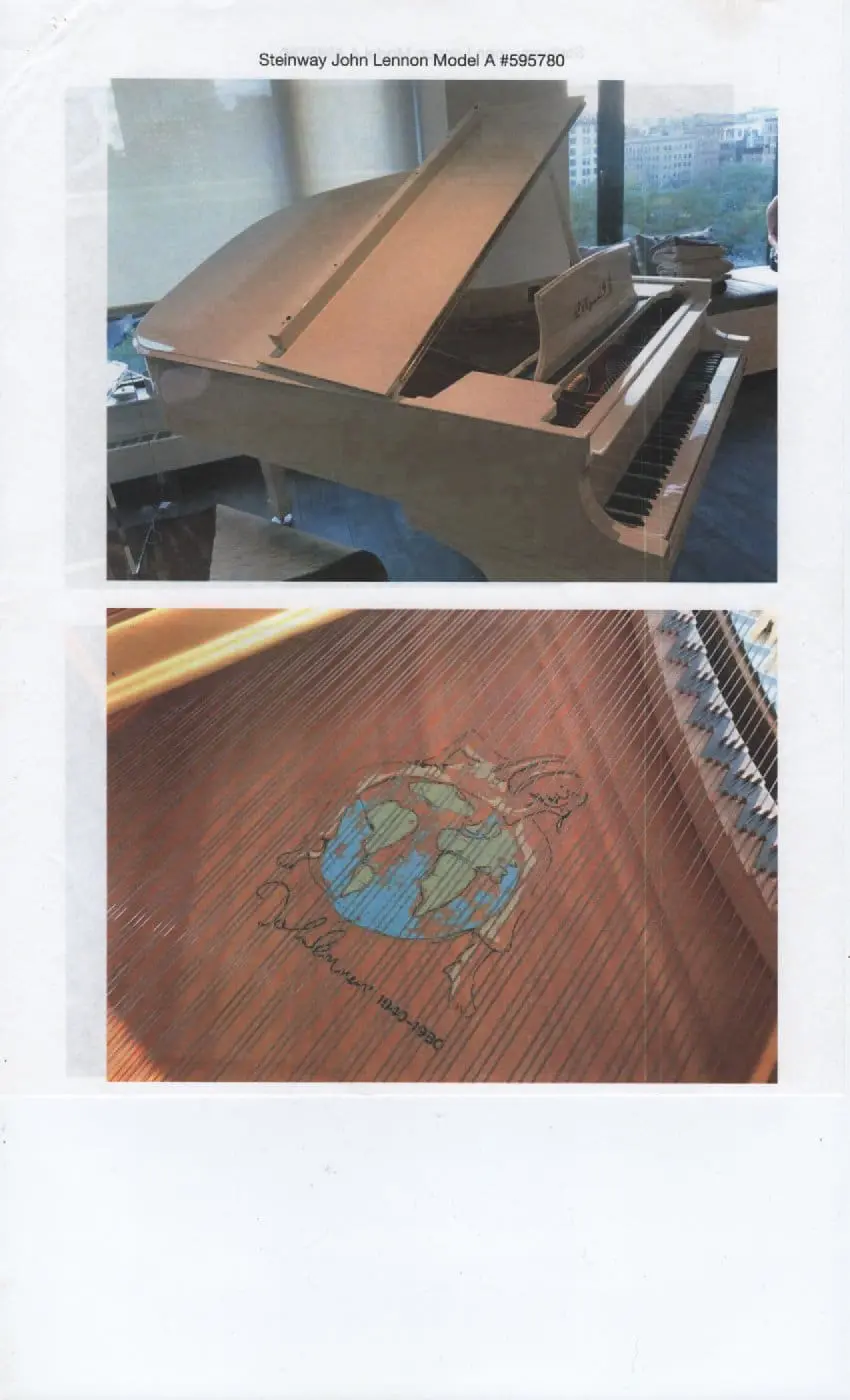 This 2015 Steinway & Sons John Lennon “Imagine” Series Model A grand piano is one of just 25 produced worldwide. Finished in polished white, it features the opening notes of “Imagine,” John Lennon’s signature on a numbered plaque, and one of his illustrations on the music desk. Originally owned by Dakota resident Jacqueline Bikoff, the piano later passed through her estate before being acquired for The Imagine Collection, where it stands as both a rare musical instrument and a tribute to Lennon’s artistic legacy.